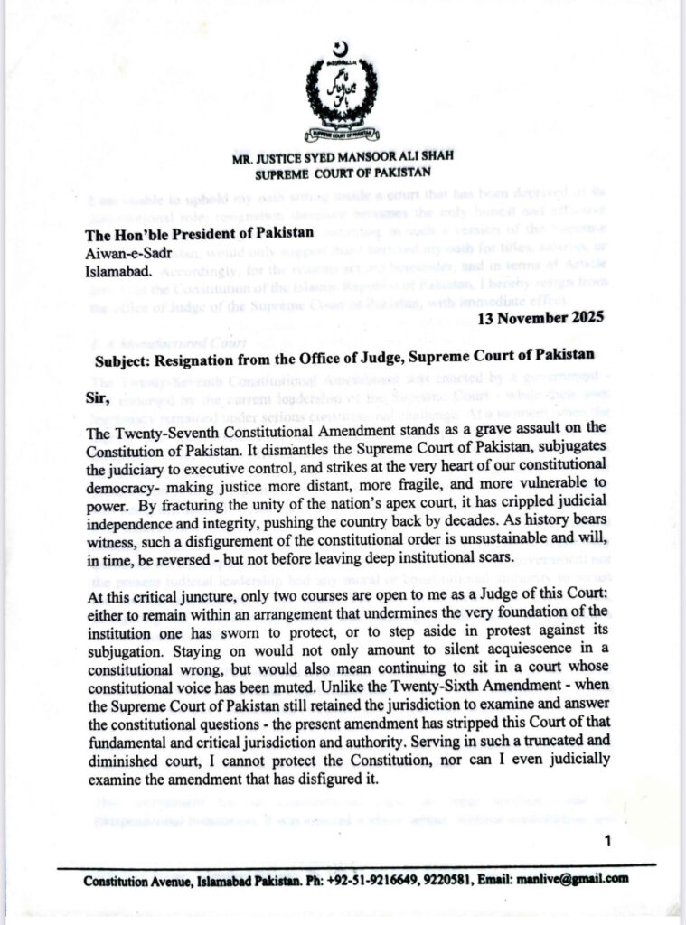 جسٹس منصور علی شاہ نے استعفیٰ صدر مملکت کو بھجوا دیا، جس میں انہوں نے لکھا کہ میں نے ادارے کی عزت،ایمانداری اور دیانت کےساتھ خدمت کی،